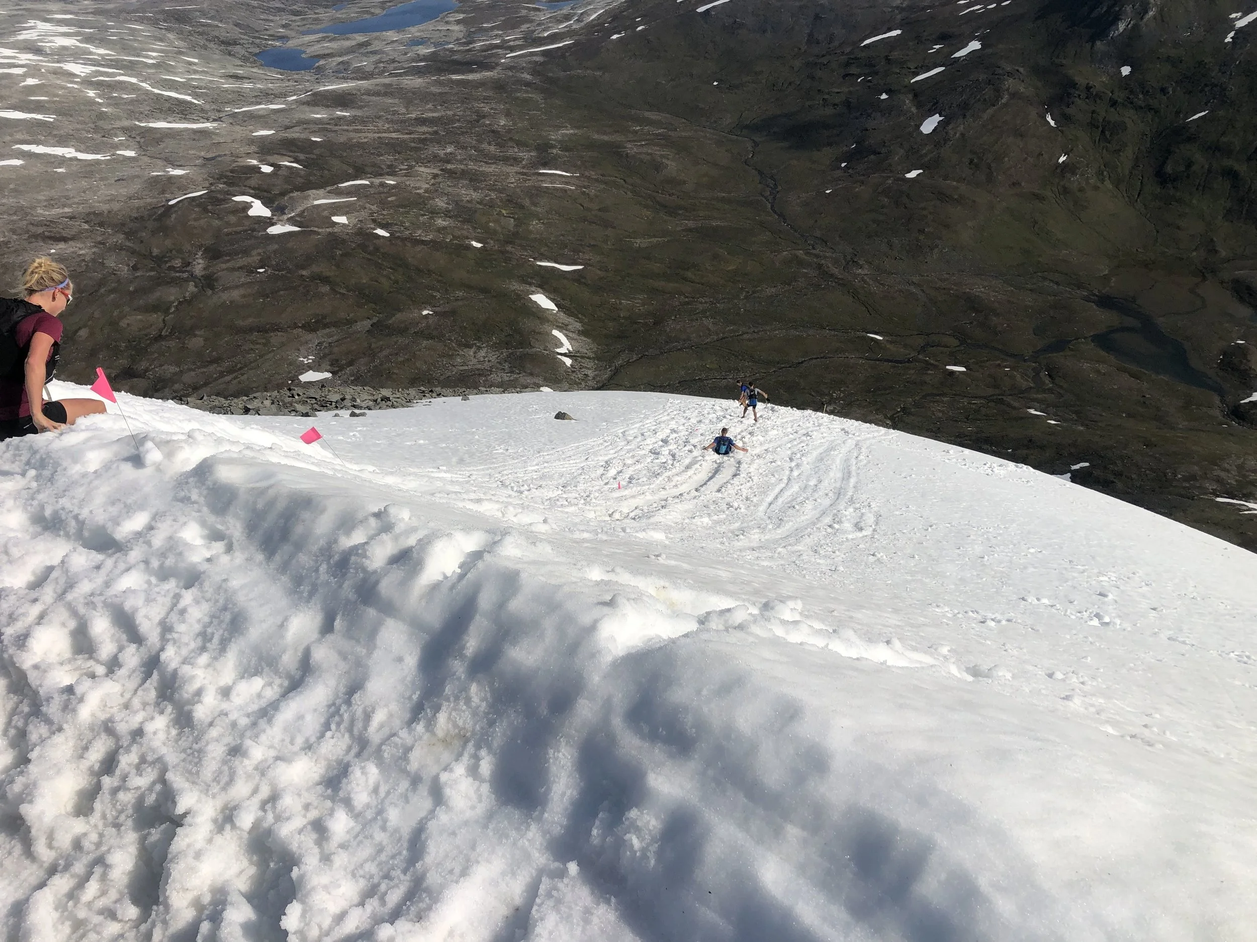 In the pre-race meeting they had told us about the snowfield on Tromdalstind. It didn’t look that bad until I got there. It was a 45-degree slope that looked like it went off a cliff. A hundred pair of feet had worn two deep grooves in the snow that I started to slide down as slow as possible. The snow then steepened but the race organizers had a couple of posts with a rope to help us on the last little bit. Once past the snow I got to deal with the steepest sustained downhill I have ever seen. This off trail section goes down around 750m in 1.75km. If you are not good with the conversions, that’s 2500 ft. in about 1.1 miles!